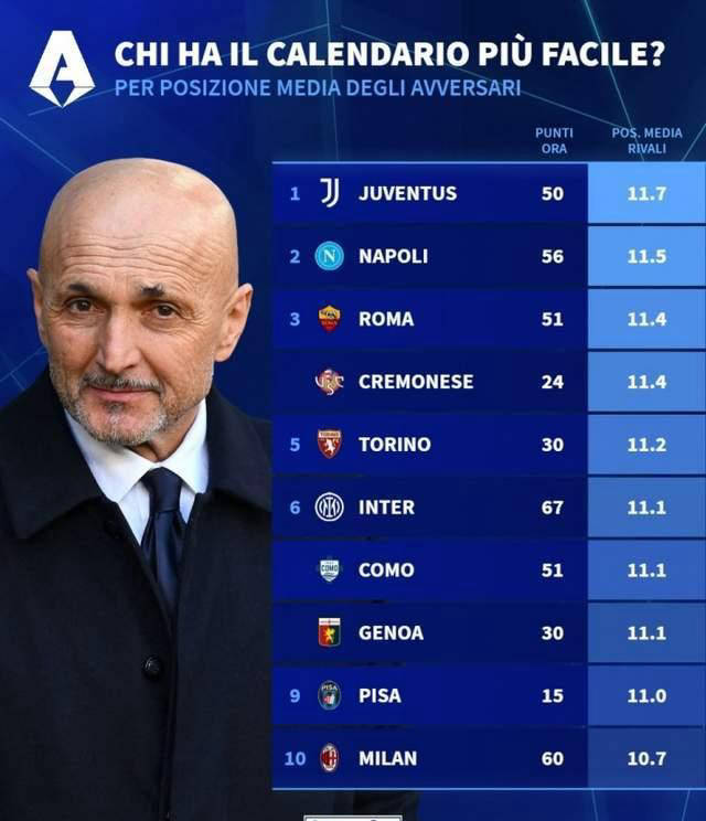 德国转会市场对剩余10轮意甲各队赛程进行了统计分析,尤文图斯以11.7的平均对手排名稳居“赛程最轻松”榜首,这为球队争取积分提供有利条件。而那不勒斯和罗马分别排名二、三位,其赛程相对较难,考验球队整体实力与稳定性。此外,克雷莫内塞和都灵则并列第四,两队面对中游偏上的对手挑战较多,后续表现值得关注。